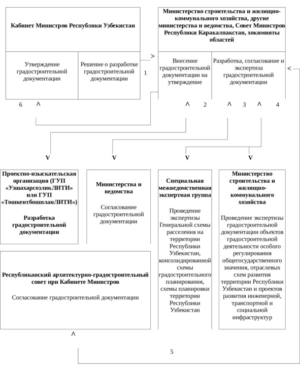 Градостроительная документация, необходимая для реализации строительных проектов, подлежит рассмотрению Республиканским архитектурно -градостроительным советом при Кабинете Министров Республики Узбекистан. Данный совет обязан рассмотреть представленную документацию в течение десяти дней с момента ее получения. При положительном заключении государственной экспертизы и одобрении на Республиканском архитектурно -градостроительном совете, подготавливается проект постановления Кабинета Министров Республики Узбекистан об утверждении данной документации. Данный проект в дальнейшем вносится в Кабинет Министров Республики Узбекистан для окончательного утверждения.