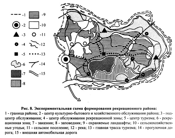 Рис. 8. Экспериментальная схема формирования рекреационного района представляет собой планировку территории, на которой предполагается создание уникального места для отдыха и развлечений. На рисунке обозначены следующие объекты: 1 – граница района, определяющая его территорию; 2 – центр культурно -бытового и хозяйственного обслуживания района, где будут расположены магазины, кафе и другие объекты инфраструктуры; 3 – под центр обслуживания, который будет предоставлять услуги для отдыхающих; 4 – центр обслуживания рекреационной зоны, где будут расположены гостиницы, кемпинги и другие объекты размещения; 5 – центр туризма, который будет предлагать различные экскурсии и развлечения; 6 – рекреационная зона, где будут расположены парки, пляжи и другие места для отдыха; 7 – заказник, который будет охранять природные ресурсы района; 8 – заповедник, который будет защищать уникальные экосистемы; 9 – охраняемые ландшафты, которые будут сохраняться в их первозданном виде; 10 – сельскохозяйственные угодья, которые будут использоваться для сельского хозяйства; 11 – сельское поселение, где будут проживать местные жители; 12 – река, которая будет являться одной из главных достопримечательностей района; 13 – главная трасса туризма, по которой будут проходить экскурсии и туристические маршруты; 14 – прогулочная дорога, предназначенная для прогулок и отдыха; 15 – внешняя автомобильная дорога, которая будет соединять район с другими населёнными пунктами. Все эти объекты будут взаимосвязаны и обеспечат комфортный и интересный отдых для посетителей рекреационного района.