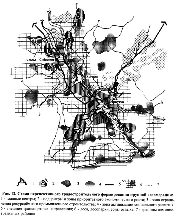 На рисунке 12 представлена схема перспективного градостроительного формирования крупной агломерации. На ней обозначены следующие элементы: 1 – главные центры, которые являются основными узлами развития агломерации; 2 – под центры и зоны приоритетного экономического роста, которые имеют большой потенциал для развития и привлечения инвестиций; 3 – зона ограничения ресурсоемкого промышленного строительства, где необходимо учитывать экологические и ресурсные ограничения; 4 – зона активизации социального развития, где предусмотрены места для размещения социальной инфраструктуры; 5 – внешние транспортные направления, которые обеспечивают связь с другими регионами; 6 – леса, лесопарки, зоны отдыха, которые являются важными природными ресурсами и местами отдыха для жителей агломерации; 7 – границы административных районов, которые определяют территорию агломерации и ее административное деление. Эта схема позволяет оптимизировать развитие агломерации и обеспечить ее устойчивое и гармоничное развитие магистралей, увеличению пропускной способности и совершенствованию техни-ческого обеспечения.