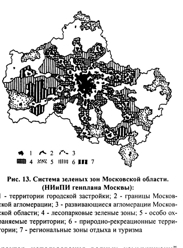 На рисунке 13 представлена система зелёных зон Московской области, разработанная НИиПИ генплана Москвы. Она включает в себя территории