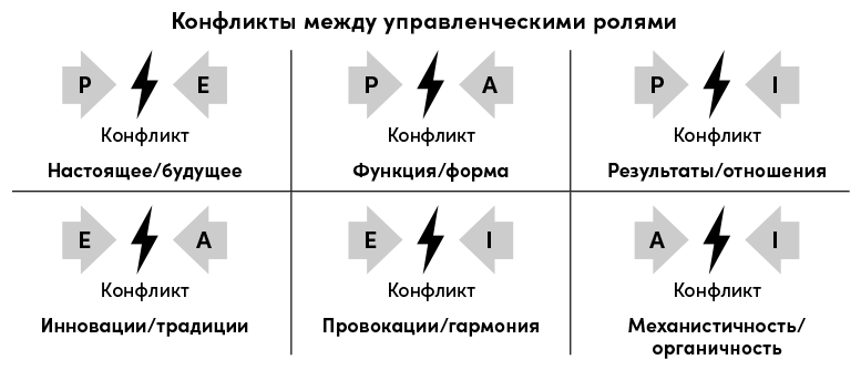 Верно и обратное: A-роль порой опасна для E-роли. Если вы замораживаете новые идеи ради эффективности, это ограничивает вашу способность действовать с упреждением и результативно в долгосрочной перспективе. Корпоративная политика, правила, регламентированное поведение препятствуют переменам.