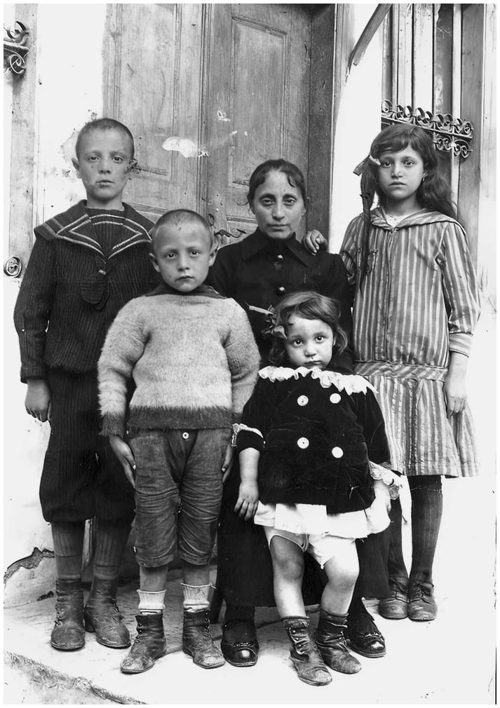 Кальдероны: на переднем плане – моя мать Диаманта Дука в возрасте пяти лет с моей бабушкой Джентиль Камхи; за ней Рако и Хаим; слева от нее – ее сестра Гермоза. Манастир (ныне Битола). Македония, около 1922 года