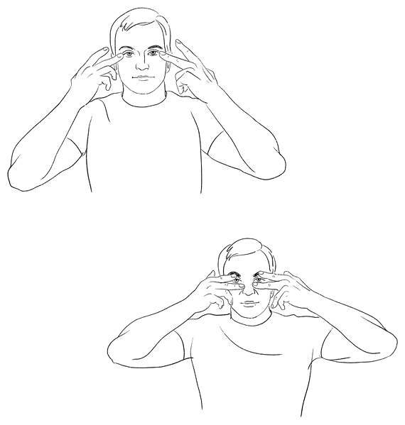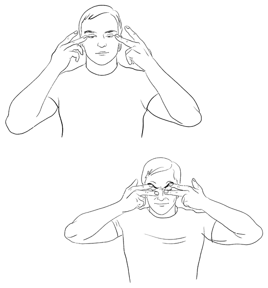 Чтобы прекратить тик века, необходимо выполнить два упражнения. Первое называется «Жмурки». Оно выполняется с закрытыми глазами. Вам следует приложить указательный и средний палец обеих рук ладонной стороной к векам (рис. 1). После чего слегка придавить пальцами веки, как бы препятствуя их движению. Одновременно вы пытаетесь сильно сжать веки вместе, но пальцы препятствуют этому движению (рис. 2). Продержите такое состояние 5-10 секунд, после чего слегка помассируйте веки и повторите упражнение.