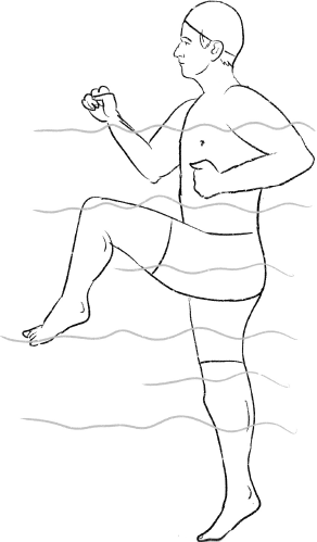 13. «Маршируем в воде». ИП – вертикально в воде, руки сжаты в кулаки. Выполняете шагающие, марширующие движения, высоко поднимая колени. Одновременно синхронно двигаете руками, как во время марша. Руки обязательно сжаты в кулаки, чтобы не создавать излишнего сопротивления воде. При этом упражнении происходят небольшие вращательные движения в грудных межпозвонковых суставах. Повторите 15–20 раз.