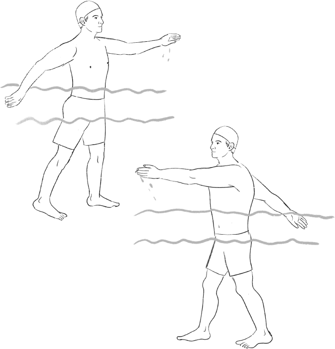15. «Тянемся одной рукой». ИП – вертикально в воде. Вытягиваете одну руку вперед, вторую назад. Удерживаете положение 1–2 секунды, далее выполняете упражнение, сменив положение рук на противоположное. Повторите 10–15 раз.