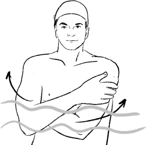 17. «Объятие». ИП – вертикально в воде. Обнимаете себя за грудную клетку. Для этого располагаете ладони на противоположной стороне грудной клетки. Вы стараетесь завести ладони как можно дальше на противоположную сторону, «цепляясь» за кожу грудной клетки. Когда вы достигнете максимального перекрещивания рук, удержите это положение 5–20 секунд. Повторите 1–3 раза.