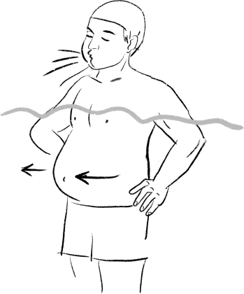Активная работа брюшным прессом в воде снимает суставные блоки в поясничном отделе позвоночника и ликвидирует боли в пояснице. Произведите медленный и глубокий вдох грудной клеткой. Живот при этом ВЫПЯЧИВАЕТСЯ ВПЕРЕД И ТОЛКАЕТ воду. Далее задержитесь на вдохе 1–2 секунды, после чего резко выдыхаете И ГРУДНОЙ КЛЕТКОЙ, И ЖИВОТОМ, который на выдохе подтягивается. Если вы чувствуете кожей живота колебания воды, следовательно, вы правильно выполняете упражнение. Повторите 10–15 раз.