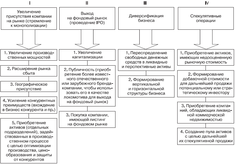 Рассматривая вопросы стратегии, необходимо отметить, что стратегия компании формируется исходя из тех целей и задач, которые ставит перед собой компания, использующая в своем развитии механизмы М&А. В зависимости от этого формируются и ключевые показатели, определяются критические точки, на которых и необходимо сконцентрировать внимание в рамках выработки стратегии. На наш взгляд, можно выделить 4 основных направления развития компании посредством М&А (рис. 7). В каждом из этих направлений компания определяет для себя критерии отбора компании-цели, формирует показатели, соответствующие намеченным целям, задействует имеющийся потенциал компании или привлекает необходимые ресурсы, в том числе финансовые, кадровые, административные, PR– и IR-службы и пр.