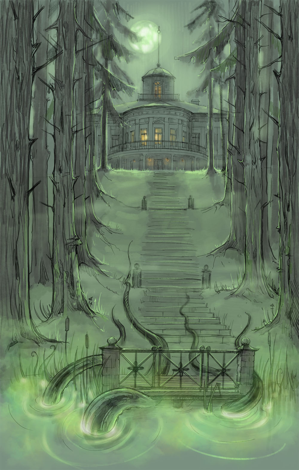 Экипаж миновал деревеньку. Дорога вскоре нырнула в сосновый лес. Высокие корабельные деревья сомкнулись над коляской, превратив солнечный летний день в настоящие сумерки. Минут через двадцать езды повозка миновала два белых каменных столба, символизирующих ворота усадьбы. Сам дом вскоре появился в конце дороги. Это был белый двухэтажный особняк с башенкой, явно перестроенный в начале века. По обе стороны от главного дома стояли два флигеля поменьше, соединенные с ним аркадами. Чуть поодаль угадывались очертания конюшен и служебных построек. Экипаж описал полукруг по парадному двору и остановился.