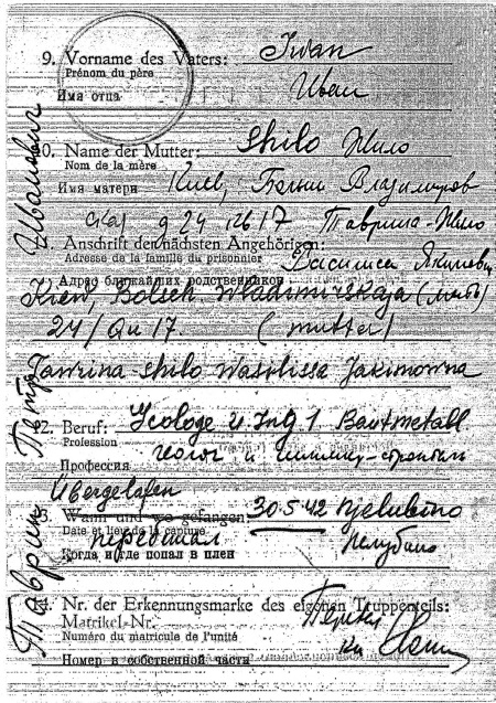 Проследим дальнейший путь перебежчика по немецким лагерям. По данным трофейной «зеленой карты», 3 ноября 1942 года Таврин прибыл из Лётцена в офлаг ХIII D (Бавария, Нюрнберг – Лангвассер, чаще упоминается как Хаммельбург, по названию полигона, на территории которого он был расположен). Запись в карте совершенно непрофессионально переведена как: «Прибыл из иностранных войск Восток, Лётцен», тогда как в действительности перевод с немецкого должен читаться: «Прибыл из Отдела иностранных армий Востока, Лётцен», то есть по линии оперативной разведки сухопутных войск. Весьма любопытной представляется графа 7, в которой военнопленный № 8105 назван командиром батальона 1196-го пехотного (по немецкой терминологии) полка. Возможно, Таврину показалось, что такое завышение статуса в Красной Армии создаст для него какие-либо дополнительные блага. Впрочем, не исключено, что оно являлось элементом легенды, разработанной для него советской разведкой перед заброской к немцам. Он также указал, что владеет полезной и уважаемой профессией геолога, специалиста по цветным металлам («buntmetall»). На русский последнее было ошибочно переведено как «инженер-строитель». Приводится в карте дата рождения – 12 июня 1909 года, и место рождения, тоже записанное с ошибкой. Вместо никому не известной деревни Бобрик писарь явно машинально указал в соответствующей графе Бобруйск. Но самое интересное в документе – указание имени и адреса матери. Записавшись двойной фамилией Таврин-Шило, пленный сообщает, что его мать Таврина-Шило Василиса Якимовна проживает в Киеве в квартире № 17 дома № 24 по улице Большая Владимирская. Как известно, столица УССР в описываемый период была оккупирована, поэтому перебежчик тем самым как бы доказывал немцам, что не вынашивает в их отношении никаких нелояльных намерений и не страшится полного раскрытия перед ними своих самых уязвимых мест. Внешне это выглядело и в самом деле так, но в действительности все обстояло как раз наоборот. И дело тут даже не в том, что весьма маловероятным представляется совпадение фамилий матери и жены (если считать правильным вариант с Шило Антониной Васильевной), и не в том, что Большой улица Владимирская тогда уже давно не именовалась. А в том, что в период обороны Киева именно в указанном доме размещался штаб обороны города, ряд семей из которого был отселен, и проверить правдивость показаний пленного немцы не могли. По просьбе автора работники Главного управления МВД Украины в Киевской области произвели соответствующую проверку и установили, что в предвоенный период Таврина-Шило В.Я. не проживала не только в данном доме, но и вообще в пределах области. Зато в процессе поиска обнаружилось иное, не менее любопытное обстоятельство: фамилия и инициалы Шило В. Я. (без Тавриной) значились в двух последних предвоенных справочниках телефонных абонентов Киева за 1938 и 1940 годы по адресу: улица Чудновского, дом № 5, квартира № 2. В послевоенном справочнике их уже не было. Проверка по архивам домовых книг не удалась, поскольку по данному адресу в настоящее время находится новый дом, заселенный в 1961 году. Как следствие, записи о предыдущих жильцах ушли в небытие вместе с предвоенным домом.