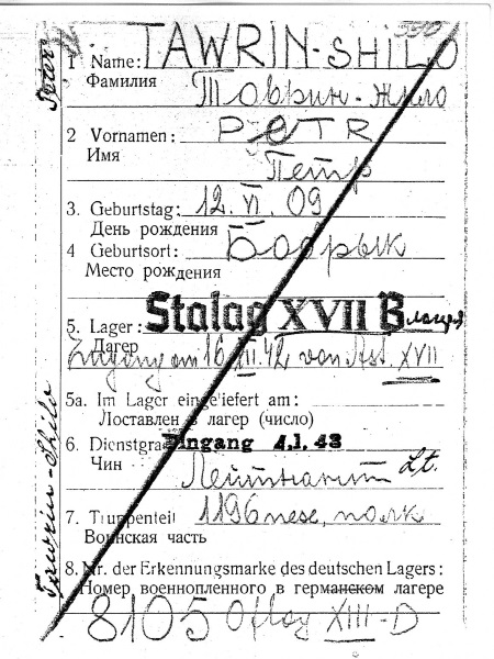 Следующая «зеленая» лагерная карта составлена в шталаге ХVII В в Гнайксендорфе, Австрия, где военнопленный № 8105 пребывал с 16 декабря 1942 по 4 января 1943 года. Шталаг (Kriegsgefangenmannschafts-Stammlager) предназначался для содержания военнопленных рядового и сержантского состава, хотя периодически при переполнении офлагов туда на время направлялись и офицеры. Она отличается от первой, помимо прочего, тем, что Таврин фигурирует в ней уже как лейтенант, а не старший лейтенант. Попутно следует пояснить, почему в русской части карты фамилия Шило транслитерируется переводчиком как Жило. Это является следствием фонетической нормы немецкого языка, в котором сочетание букв SH передает звук «Ж», а звук «Ш» должен изображаться сочетанием SCH. По указанной причине написание «Жило» не должно вводить в заблуждение.