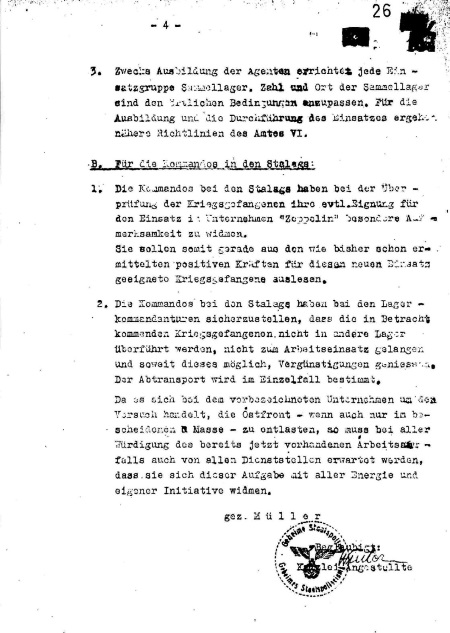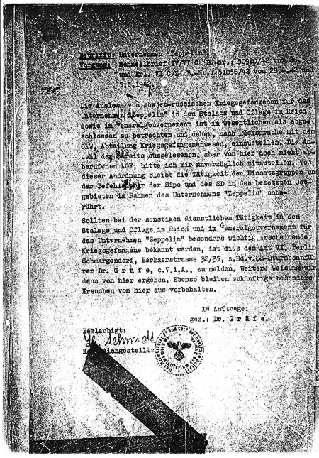 Отбор советских русских военнопленных для операции «Цеппелин» в офицерских и солдатских лагерях в Рейхе и Генерал-губернаторстве следует считать в основном завершенным, в связи с чем согласно результатам переговоров с отделом по делам военнопленных ОКВ он должен быть прекращен. Я прошу незамедлительно сообщить мне количество уже отобранных, но еще не освобожденных оттуда военнопленных. Данное распоряжение не затрагивает деятельность айнзатцгрупп и начальников полиции безопасности и СД в оккупированных восточных областях в рамках операции «Цеппелин».