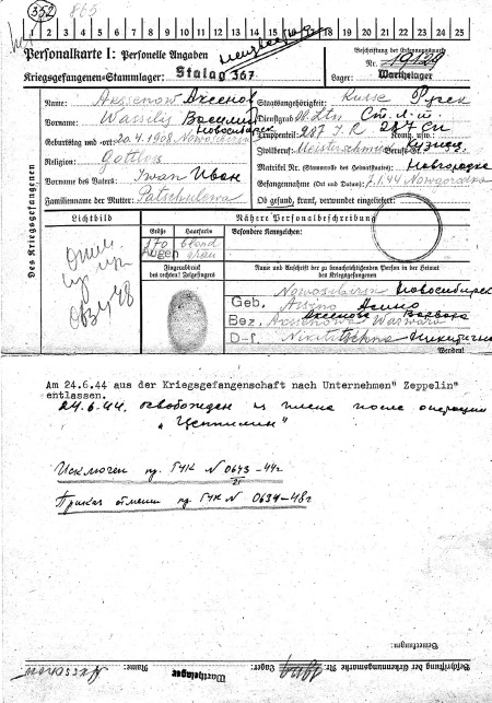 Там указывается, что 8 августа 1943 года пленный был повторно пойман (имеется в виду после его первичной сдачи в плен), но, против ожидания, Таврина не отправили в концлагерь, не перевели в штрафной барак и вообще никак не наказали. Более того, следующая отметка гласит, что уже 9 августа с ним были установлены гражданские правоотношения. В соответствии с нормами действовавшего в рассматриваемый период германского законодательства это означало, что с ним был заключен некий контракт, и он перестал быть военнопленным, а приобрел полноправный статус, позволявший ему пребывать за пределами лагеря и выполнять некую работу. Какую – можно лишь догадываться. Гражданский статус получали все пленные, завербованные спецслужбами для агентурной работы, зачисленные на инженерные или прочие должности на германские предприятия, – в общем, все, за исключением принятых на службу в вермахт или СС. А в лагерных картах «активистов» «Цеппелина» писалось прямо и недвусмысленно: «Принимал участие в операции «Цеппелин» с такой-то даты, снят с учета военнопленных». Формулировки могли несколько отличаться друг от друга. К примеру, в картах военнопленных можно встретить отметку: «Am (дата) aus der Kriegsgefangenschaft nach Unternehmen «Zeppelin» entlassen» («Освобожден из плена для операции “Цеппелин”»).