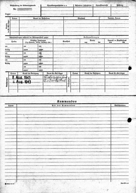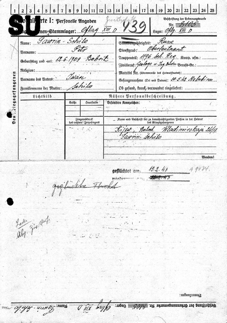[Закрыть], а в марте 1943 года пополнен личным составом предварительного лагеря (форлагерь) в Бреслау. Именно в Зандберге Таврин, по его словам, был зачислен в «Особую команду» по подготовке будущих агентов к работе в советском тылу. Однако документ, обнаруженный автором в отделе документации Фонда саксонских мемориалов города Дрездена, открыл новый и интригующий эпизод в период жизни Таврина с февраля по август 1943 года. Это – персональная карта советского военнопленного Петра Ивановича Шило-Таврина[123]123