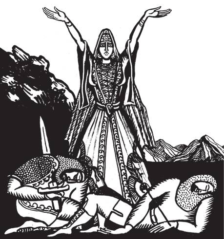 На рассвете вышла из шатра старуха. Один глаз у неё был слеп, а из второго торчала стрела. Стонет старуха от боли и несёт в руках полотенце Ахсара.