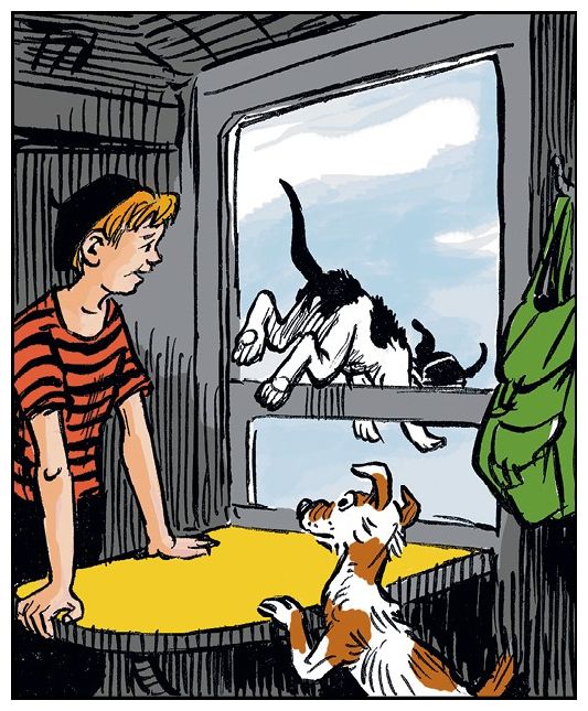 Петя устроился в своём купе и приоткрыл окно. Потом он выпустил Мика и Мука из рюкзака. Но тут Петя вспомнил, что не успел купить газету.
