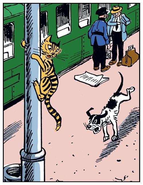 А вот Мук сразу понял, в чём дело. Его отличный слух и хорошее чутьё подсказали ему, что где-то там, на перроне, его приятель просто гонялся за кошкой! А сейчас загнал эту кошку на фонарный столб, сидит под этим столбом и тявкает.