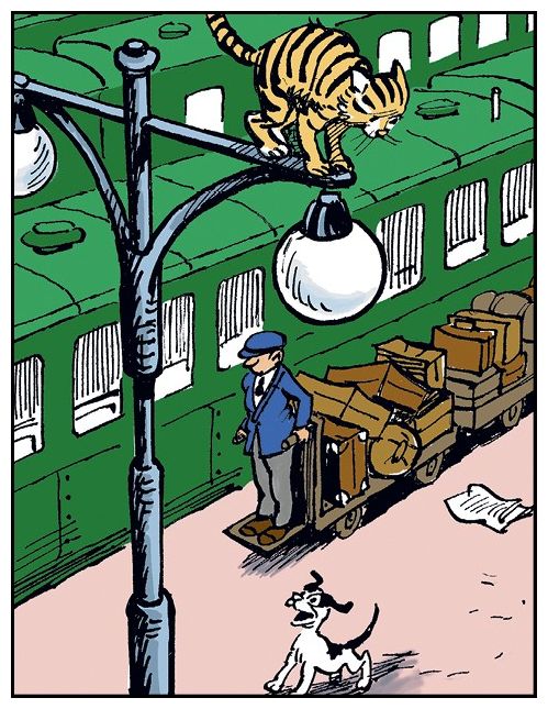 Мимо по перрону проходили запоздавшие пассажиры, носильщики таскали и возили на тележках чемоданы… Никто не обращал никакого внимания на скулящую собаку и фыркающую кошку на фонарном столбе.