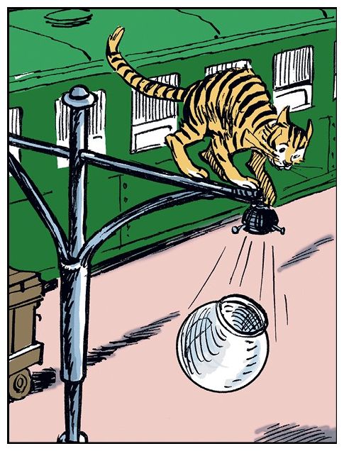 В то мгновение Мик отвлёкся от кошки и не смотрел вверх. Он оглянулся на поезд. Паровоз дал короткий гудок, а вагоновожатые, стоявшие у дверей каждого вагона, покрикивали: «Провожающие! Пожалуйста, покиньте вагоны! Поезд скоро отправляется».