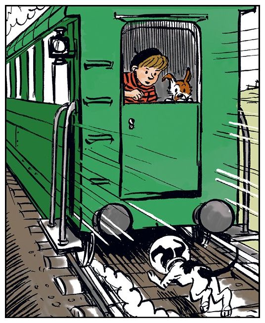 А в купе поезда волновались Петя и Мук. Они поняли, что Мик опоздал, и побежали через весь состав в конец поезда. Из окна последнего вагона они увидели отставшего Мика, бегущего по шпалам.