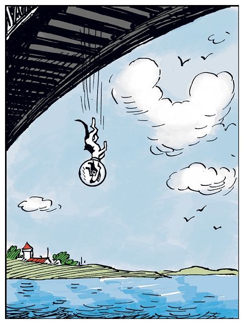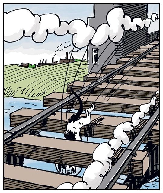 Но тут Мик споткнулся о шпалу, соскользнул с моста и полетел вниз головой в реку. Он только успел подумать: «Ох, прощайте, мои друзья – Петя и Мук!»