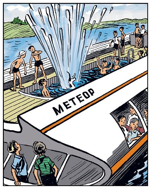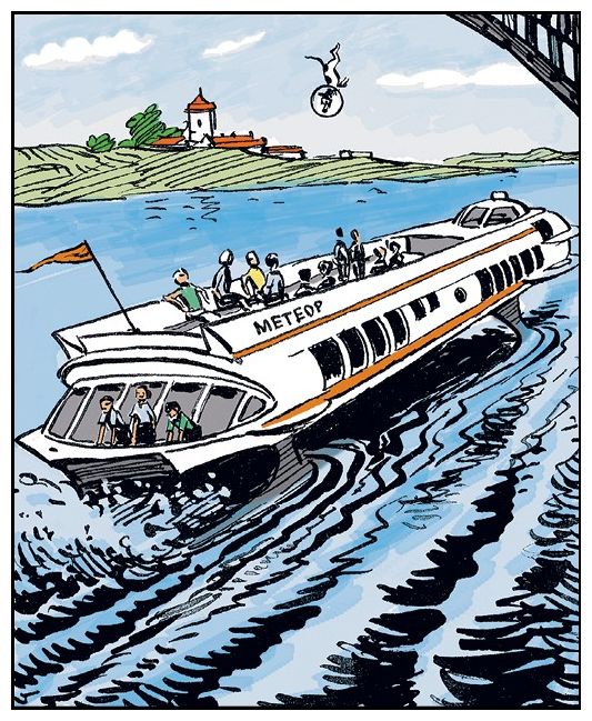 Когда Мик летел с моста головой вниз в глубокую реку, под ним проплывал скоростной теплоход «Метеор». Корабль плыл по рекам и каналам на Север, как раз к Архангельску. Мик летел в реку и успел заметить, что прямо под ним корабль. Это его ужасно испугало. Ведь упасть на палубу корабля с такой высоты означало верную гибель!