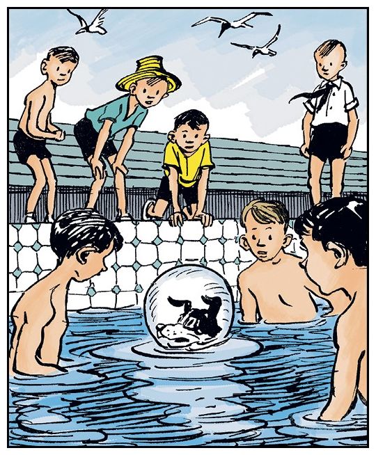 Тем временем ребята заметили плескавшегося Мика и стали наперебой строить догадки: что за существо плюхнулось к ним прямо с неба?