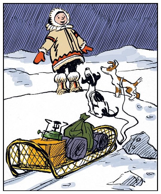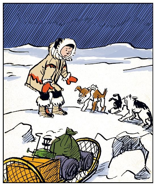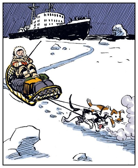 Мик и Мук устали плыть на корабле. Им очень хотелось побегать по бескрайним заснеженным просторам. И они резво потащили сани на север.