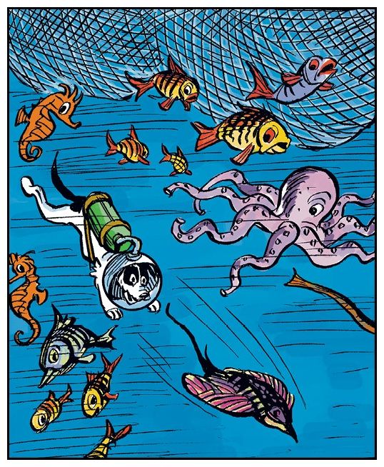 В том месте рыбаки огромными сетями ловили рыбу. И кот решил спрятаться под сетью. Он поднырнул под сеть и поплыл ещё глубже. Но Мик не отставал и продолжал погоню. Рыбки, морские коньки, медузы и осьминоги только и успевали шарахаться в стороны!