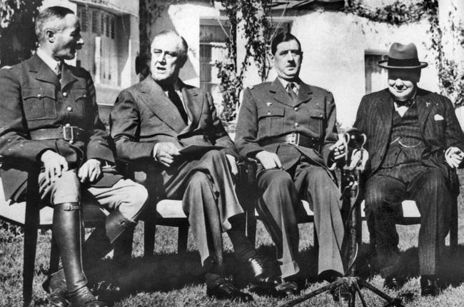 На конференции в Касабланке в январе 1943 г. Генерал Анри Жиро, Франклин Рузвельт, Шарль де Голль и Уинстон Черчилль