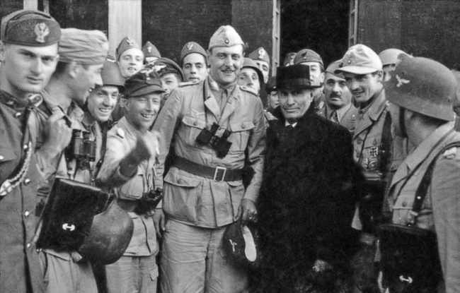 Это он выполнил дерзкую операцию по освобождению из заключения Бенито Муссолини. 12 сентября 1943 года Скорцени с группой парашютистов десантировался в горном районе Гран-Сассо. Именно там, в отеле «Кампо Императоре», содержался в заключении Муссолини, которого к тому времени сместили итальянцы. Хорошо охраняемого диктатора Италии Скорцени освободил без единого выстрела и доставил в Мюнхен на ковер к Гитлеру. После чего