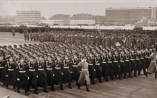 Прохождение парадной «коробки» суворовцев Калининского Суворовского военного училища по Красной площади на параде в честь 64-й годовщины Великой Октябрьской социалистической революции 7 ноября 1981 года. [Из открытых источников]