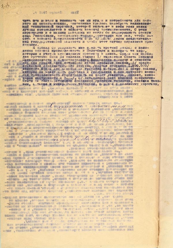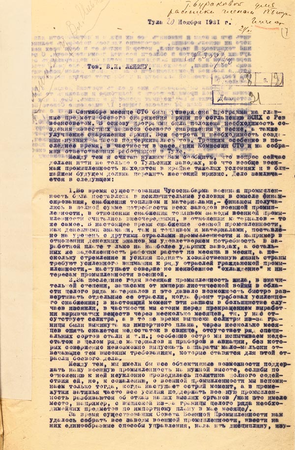 Письмо председателя Совета военной промышленности П. А. Богданова председателю СНК В. И. Ленину о положении военной промышленности и мерах по ее укреплению. 20 ноября 1921 г. // Российский государственный архив новейшей истории (РГАНИ). Ф. 3. Оп. 46. Д. 330. Л. 7–7 об.