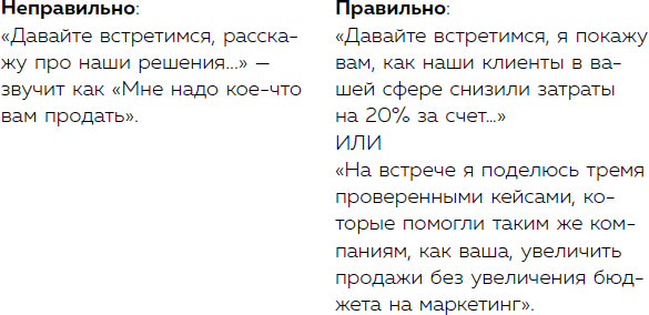 Клиент платит вам не только деньгами. Он отдает вам свое время, свою энергию. Если он не видит, почему должен потратить их на вас, – он не будет покупать. Точно так же, если он не понимает, зачем ему тратить время на встречу, – он просто откажется.