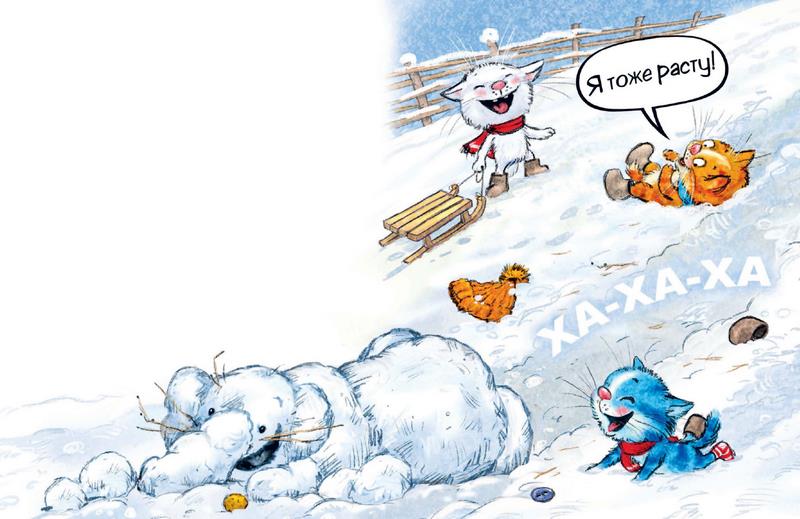 Обратно с горки скатились уже три снежных кома. Внизу на кочке подпрыгнули, обсыпались и превратились в трёх котят, один без валенка.