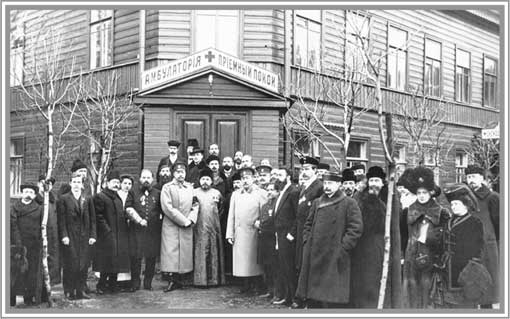 Группа врачей и горожан со священником у входа в здание, где размещалась амбулатория и приемный покой Станции подачи первой помощи за Московской заставой. С.-Петербург. 1910-е гг. Фото ателье К. Буллы