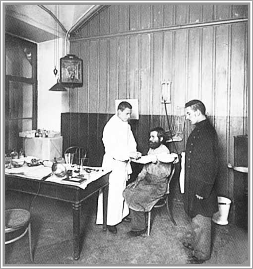 Рабочий сенатской типографии в амбулатории во время перевязки. С.-Петербург. 1910-е гг. Фото ателье К. Буллы
