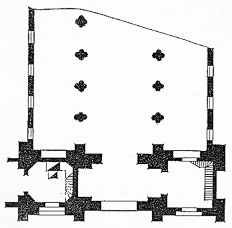 Пространственная схема Шапели включала две квадратные башни (одна из которых «разрушена» до первого яруса, другая – «укреплена» по углам готическими контрфорсами). Башни связаны переходом с расположенным под ним арочным проездом. На стены и средний ярус (террасу) Шапели ведет узкая лестница, по которой можно было пройти в саму капеллу.