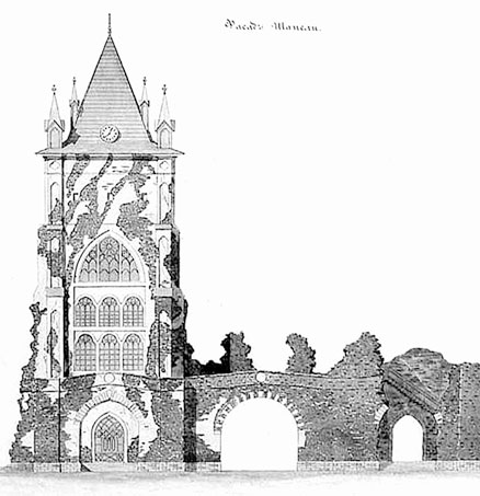 Практически одновременно с Белой башней возводился павильон Ворота-руина (1823–1824). Этот павильон композиционно формировался двумя крепостными башнями, связанными переходом, и был стилизован под разбитую ядрами часть стены замка около его главных ворот. Арочные ворота имитировали въезд в замок с обязательным подъемным мостом через ров. Сами ворота были оснащены имитацией подъемной решетки-герсы. Над воротной аркой размещалась лепная композиция с геральдическим щитом. В функциональном плане двухэтажные пристройки к павильону использовались в качестве квартир ближайшей императорской прислуги.