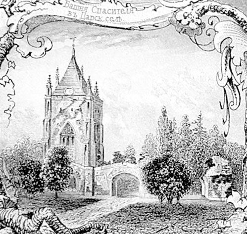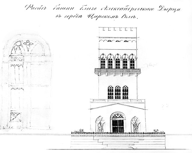 [Закрыть]; в 1824 г. «на сделание в Башне близ Нового дворца чугунной лестницы, настилку террасы, сделание баляс и решеток и отлитие из чугуну фигур и львов» потратили еще 56 732 руб. Тогда же на «заготовку внутренних украшений для оной башни» истрачены 25 000 руб. И, наконец, на устройство «при оной башне служб и сделание поезжалой дороги» пошло 30 000 руб.[345]345