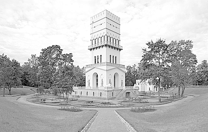Парковый павильон Белая башня был построен на обжитом месте. Когда-то здесь находился один из бастионов Царскосельского Зверинца. Его территория, огороженная кирпичными стенами, была густо населена разным зверьем, которое без особых хлопот и в неимоверных количествах отстреливали царственные «охотники». К началу XIX в. эта забава отошла в прошлое, и кирпичные стены Зверинца начали разбирать (1818–1823 гг.). Однако этот бастион Зверинца сохранили, и на его фундаменте по проекту А. Менеласа построили Белую башню высотой 37, 8 м (1822–1827)[342]342