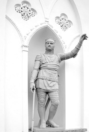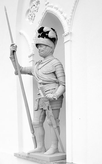 [Закрыть], одним из отцов-основателей которого был Александр I. (Как пишет Шуазель-Гуфье, на каждой из четырех сторон по два рыцаря, всего восемь, то есть каждая скульптура повторялась дважды.) Лежащие на террасе Белой башни четыре чугунных скульптуры львов были отлиты в 1825 г. по модели Л. Ландини.
