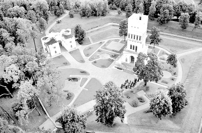 Белая башня, напоминающая донжон рыцарского замка, стала одним из последних парковых проектов, построенных по распоряжению Александра I. Графиня Шуазель-Гуфье упоминает, что, гуляя по Александровскому парку, она и Александр I «подошли к новому зданию, которое государь ради развлечения строил в парке. Это была очень высокая четырехугольная башня, так называемая башня рыцарей, так как с четырех сторон ее, в нишах, стояли статуи рыцарей. В этом здании предполагалось поместить юного великого князя Александра»[343]343