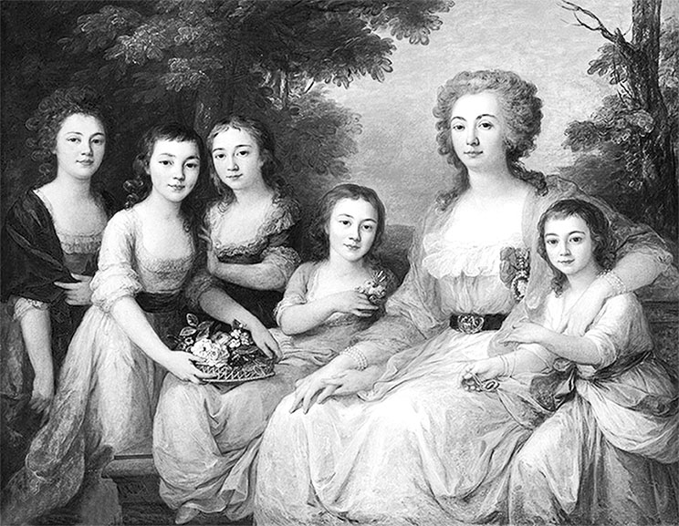 Императрица Екатерина II в окружении членов семьи и придворных. С гравюры Ф. Г. Сидо. 1784 г.