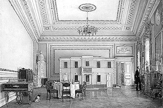 Весной 1826 г. семья Николая I, по традиции, уехала «на дачу», сначала в Царское Село, а затем в Петергоф, рассчитывая вернуться в Зимний дворец поздней осенью. Все это время в главной императорской резиденции шел капитальный ремонт, в ходе которого в северо-западном ризалите дворца формировались императорские половины.