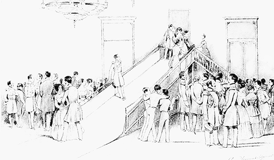 В детском зале, где стоял наш игрушечный домик, нас учила танцам Роз Колинетт, дебютировавшая в Малом Гатчинском театре. Мы упражнялись в гавоте, менуэте и контрдансе вместе с Сашей и его сверстниками. После этого бывал совместный ужин, и вместо неизменного рыбного блюда с картофелем нам давали суп, мясное блюдо и шоколадное сладкое. Зимой 1833 года эти веселые уроки прекратились, оттого что Мэри исполнилось пятнадцать лет и она переселилась от нас в другие комнаты»[166]166