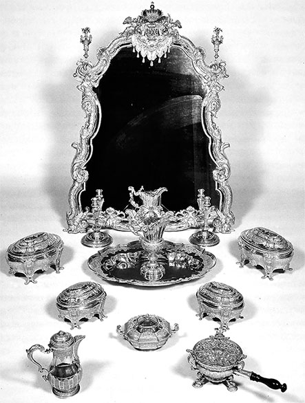 [Закрыть]. Во время передачи вещей, входивших в туалетный набор, составили подробную опись «золотому туалету, бывшему в опочивальне Ея Императорского Величества Государыни Императрицы Марии Федоровны с принадлежащему к оному вещами». Итак, «нахтышный сервиз, сделанный мастером Доном в 1736 г.», включал: