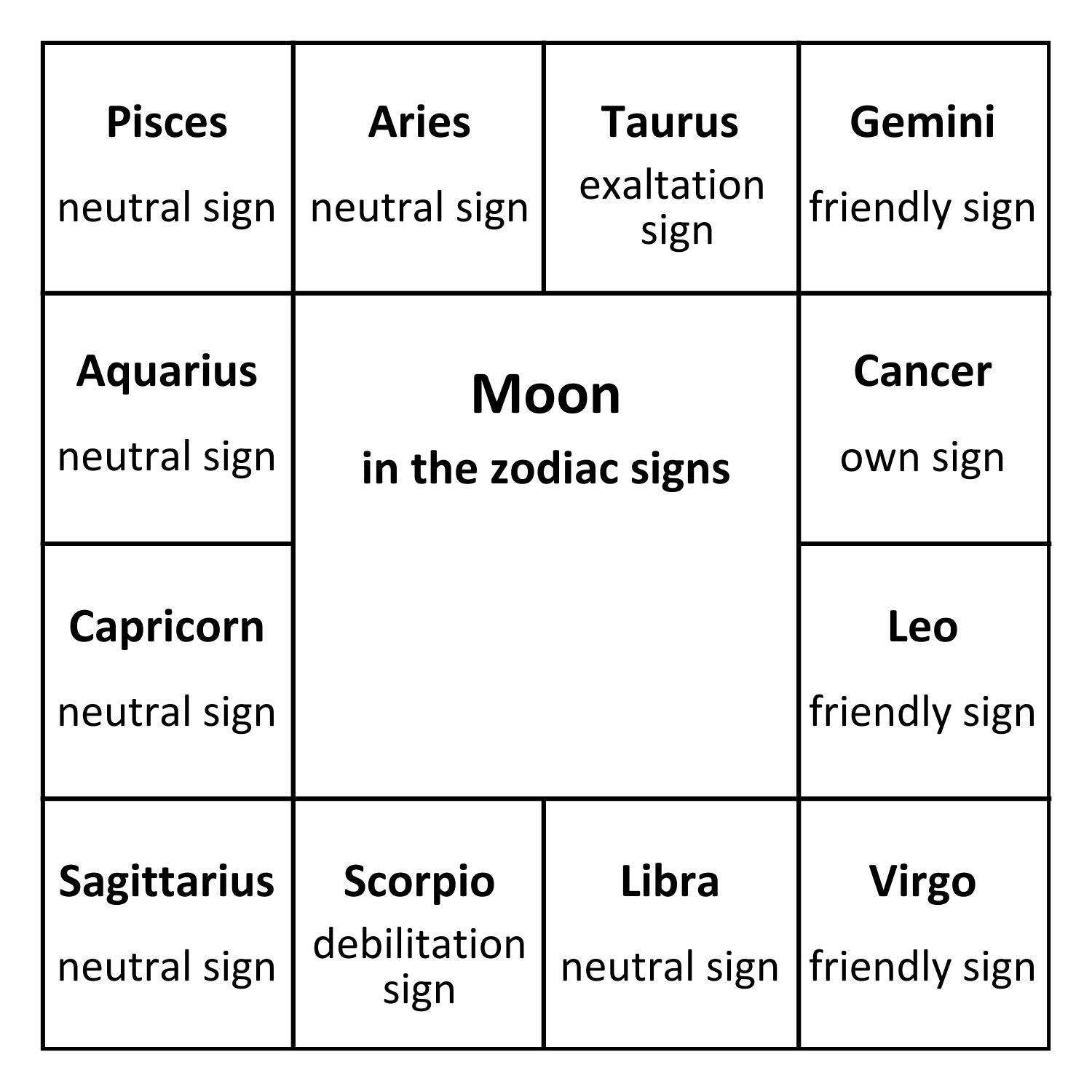 Aries, Libra, Sagittarius, Capricorn, Aquarius, and Pisces are neutral signs for the Moon, meaning it neither gains nor loses significant strength in these signs.