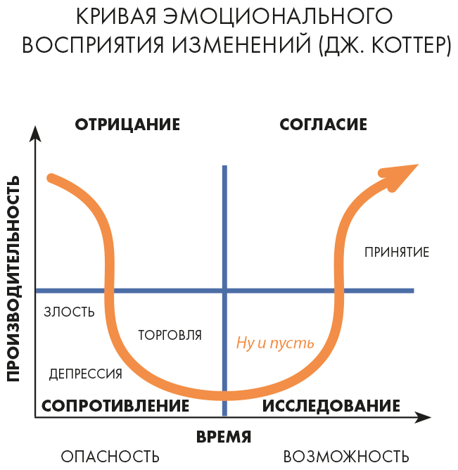Когда мы говорим про изменения, про внедрение инноваций, мы опираемся на ряд известных научных подходов. Интересно, что первые исследования адаптации к новому были посвящены изучению депрессивных состояний. В конце 1960-х гг. психолог Элизабет Кюблер-Росс предложила модель описания эмоционального состояния людей, которые переживают трагедию, тяжелую утрату и горе. Наверняка многим из вас знакомы эти пять уже канонических этапов: отрицание, злость, торг, депрессия и принятие. Оказалось, что модель Кюблер-Росс вполне подходит для анализа поведения команды, в которой происходят изменения. Человек в коллективе испытывает схожие опасения и даже страх перед изменениями. Например, переживает, что не сработается с новым руководителем, не будет соответствовать его требованиям, не сможет разделить его принципы работы и далее, далее, далее…