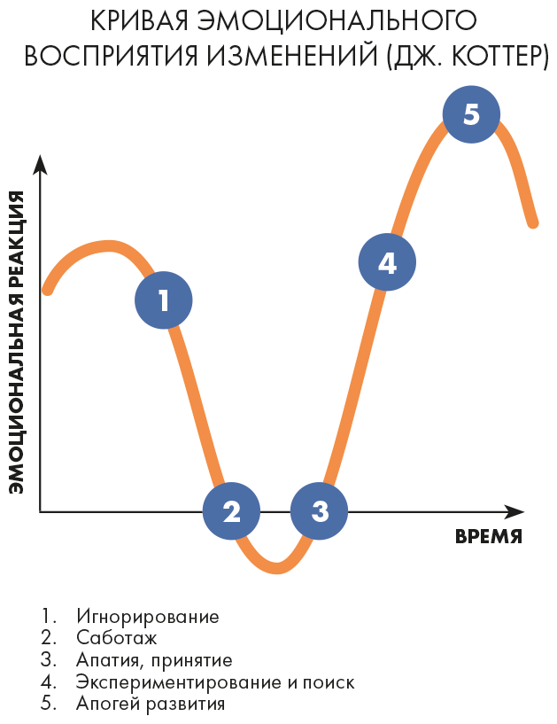 О чем нам говорят эти цифры? Главный вывод – все люди разные. И лишь 16 человек из 100 рвутся в бой, являясь адептами изменений. Большинство же присматривается и готово принять новое, если увидит свою выгоду. И это большинство определяет групповую динамику при внедрении изменений в команде. Эта динамика будет развиваться по кривой эмоционального состояния, где начальной точкой будет отрицание – игнорирование происходящего.